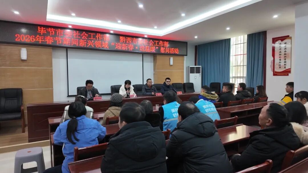 2月4日,毕节市委社会工作部、黔西市委社会工作部联合开展2026年春节期间新兴领域“迎新春·送温暖”慰问活动,为坚守岗位的快递员、外卖骑手、货车司机、网约车司机、网络主播等新就业群体送上新春祝福和生活物资。
